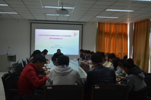 2017年3月2日早上,物理与电气工程系学生党支部全体党员在物电系CD301会议室召开会议,认真学习习近平总书记全国高校思想政治工作会议的讲话精神------做好学生的思想政治工作。本次学习会由学生党支部书记卓敏主持。